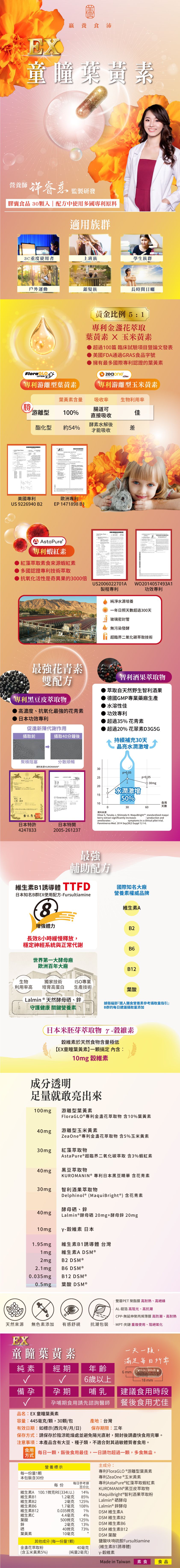 #FloraGLO ®#游離型葉黃素 #ZeaOne ®#玉米黃素 #AstaPure®#紅藻萃取蝦紅素 #KUROMANIN®#黑豆皮萃取物 #MaquiBright®#智利酒果萃取 ? 歐洲知名大廠9大輔助配方: #Lalmin® :#硒酵母、#鋅酵母 #DSM :#維生素A、#B2、#B6 、#B12、#葉酸 #Fursultiamine(#維生素B1誘導體) #γ-#穀